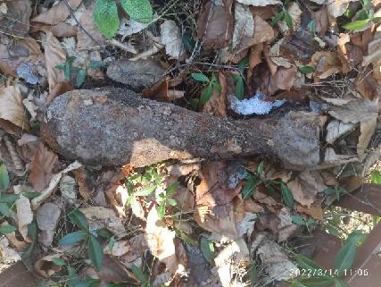 Granat moździerzowy odnaleziony w kompleksie leśnym w Żurowej. Policjanci z Tuchowa zabezpieczali niewybuch do czasu przyjazdu saperów z Rzeszowa.