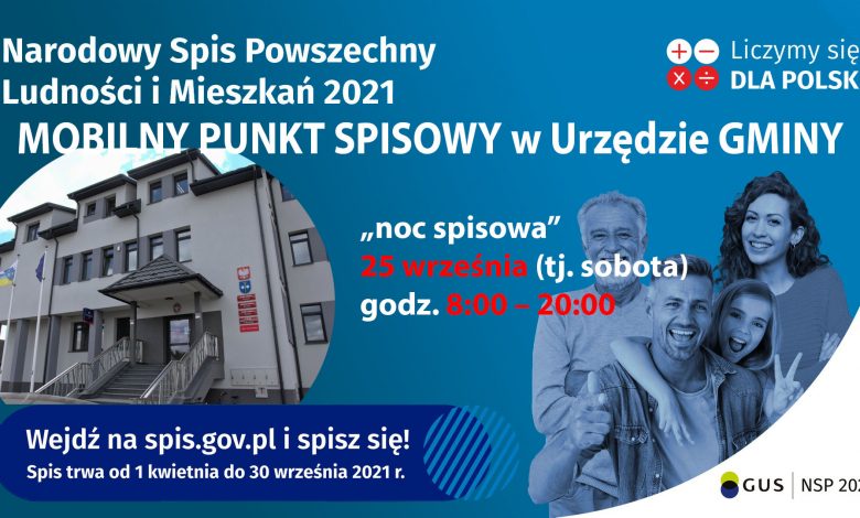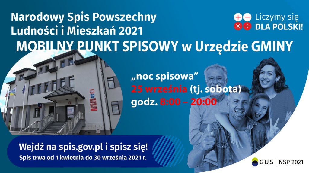 - w gminnym punkcie spisowym (w godzinach pracy Urzędu, lub podczas akcji „noc spisowa” 25 września (tj. sobota) w godz. 8:00 – 20:00