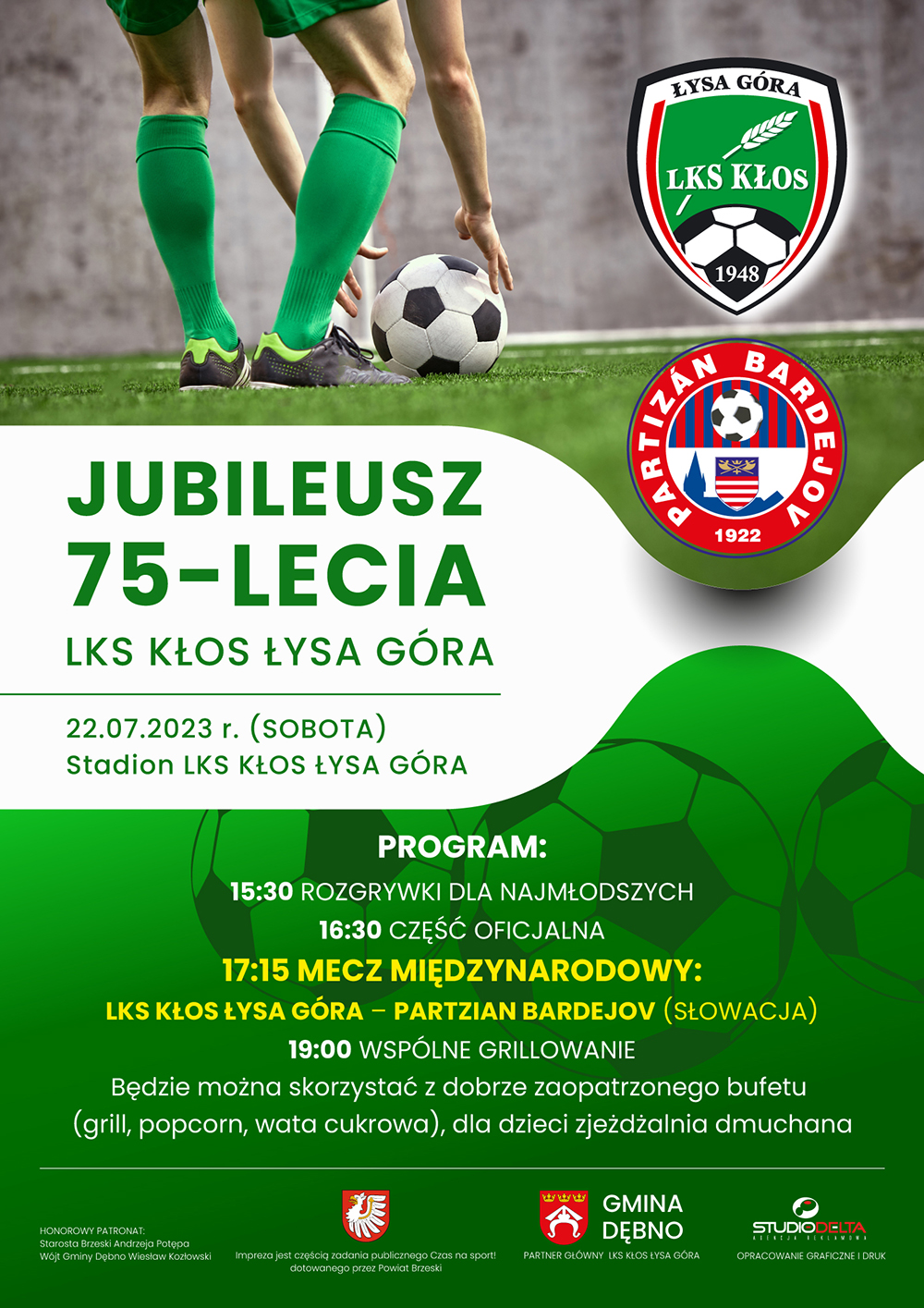 Centralnym punktem obchodów Jubileuszu Kłosa, będzie pierwszy w historii międzynarodowy mecz piłkarski: Kłos Łysa Góra – Partizán Bardejov (Słowacja), który rozpocznie się o godz. 17:15.