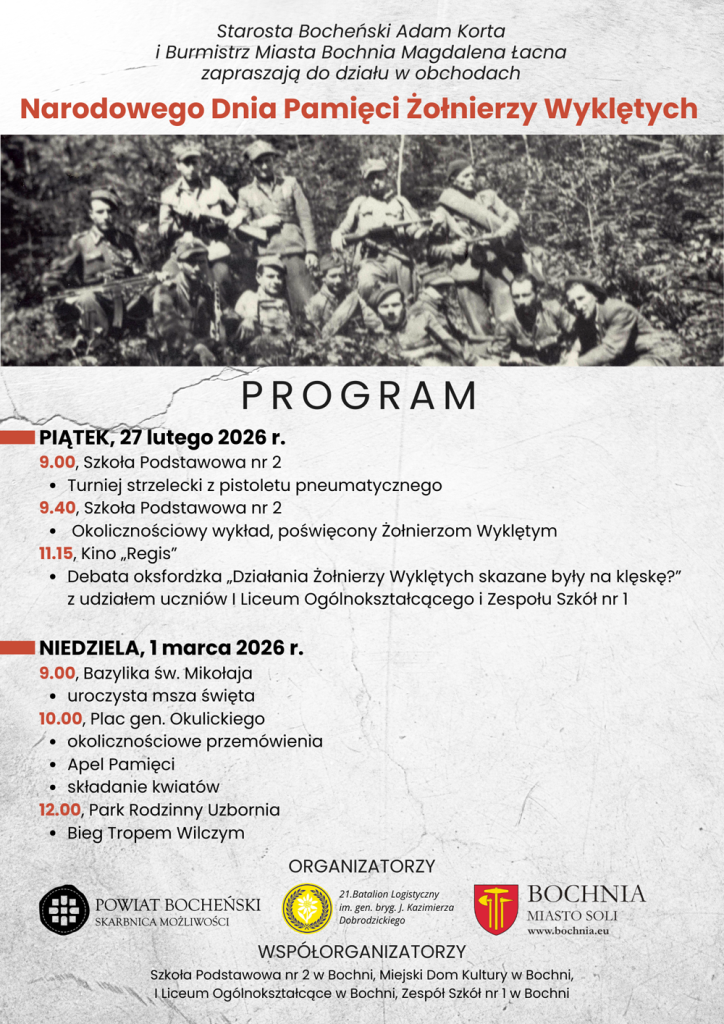 Starosta Bocheński Adam Korta i Burmistrz Miasta Bochnia Magdalena Łacna zapraszają do działu w obchodach Narodowego Dnia Pamięci Żołnierzy Wyklęty.