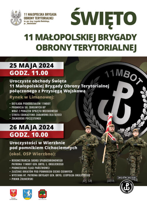 W sobotę 25 maja o godzinie 11.00 na Rynku w Limanowej odbędą się uroczyste obchody Święta 11 MBOT połączone z przysięgą wojskową. Podczas uroczystości zaprezentują się pododdziały, będzie także okazja do zapoznania się ze sprzętem wojskowym Sił Zbrojnych RP, a dla najmłodszych uczestników czekać będą gry i zabawy w strefie edukacyjno-zabawowej oraz Wawel Truck. Wszystkich zapraszamy na poczęstunek w postaci tradycyjnej żołnierskiej grochówki oraz skosztowania pieczywa z polowej piekarni. Przybyłych gości prosimy o parkowanie pojazdów w wyznaczonych miejscach.