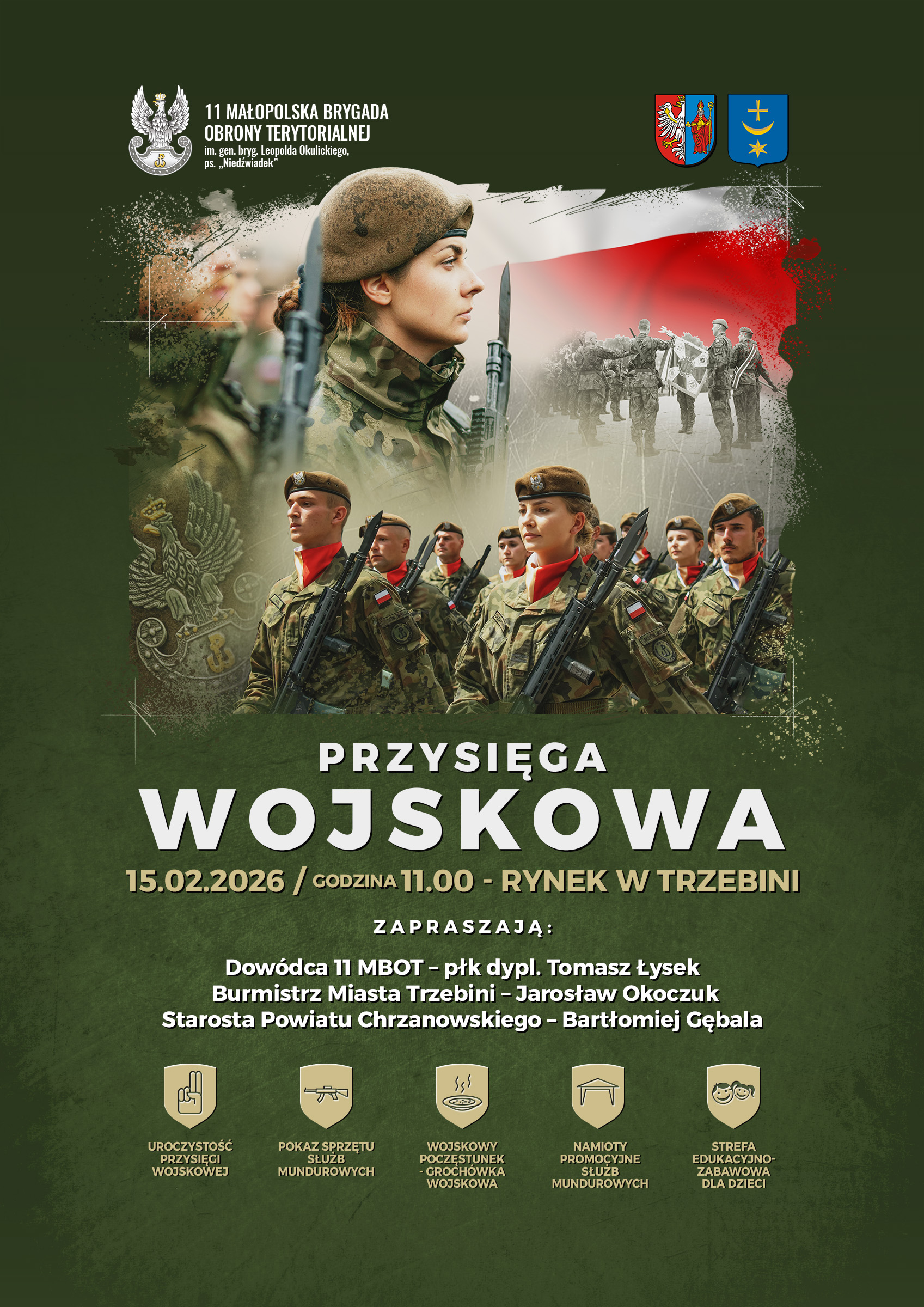 15 lutego (niedziela) o godz. 11:00 na rynku w Trzebini odbędzie się uroczystość złożenia Przysięgi Wojskowej przez żołnierzy 11 Małopolskiej Brygady Obrony Terytorialnej. Uroczystości towarzyszyć będzie oprawa muzyczno-ceremonialna w wykonaniu Orkiestry Reprezentacyjnej oraz Kompanii Honorowej Ośrodka Reprezentacyjnego Wojsk Obrony Terytorialnej. Dla przybyłych gości zorganizowany zostanie piknik wojskowy wraz z prezentacją sprzętu Jednostek z Garnizonu Kraków oraz tradycyjna wojskowa grochówka.