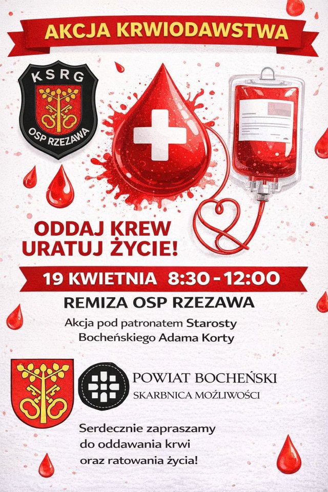 19 kwietnia (niedziela) w godz. 8:30-12:00 w remizie OSP Rzezawa odbędzie się akcja krwiodawstwa. Jeżeli pozwala Ci na to zdrowie, podziel się tym, co najcenniejsze.