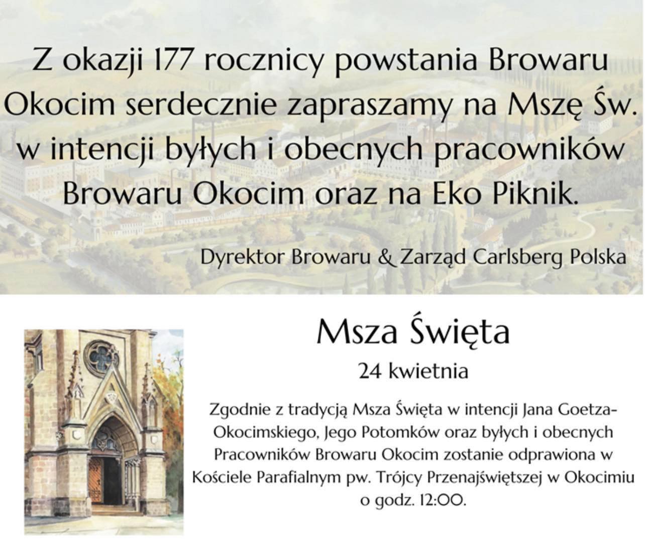 Z okazji 177 rocznicy powstania Browaru Okocim w kościele parafialnym pw. Trójcy Przenajświętszej w Okocimiu zgodnie z tradycją odprawiona zostanie Msza Święta za Jana Goetza-Okocimskiego, Jego Potomków – fundatorów świątyni, szkoły, domu ludowego oraz za zmarłych i obecnych pracowników browaru Okocim i Carlsberg SA.