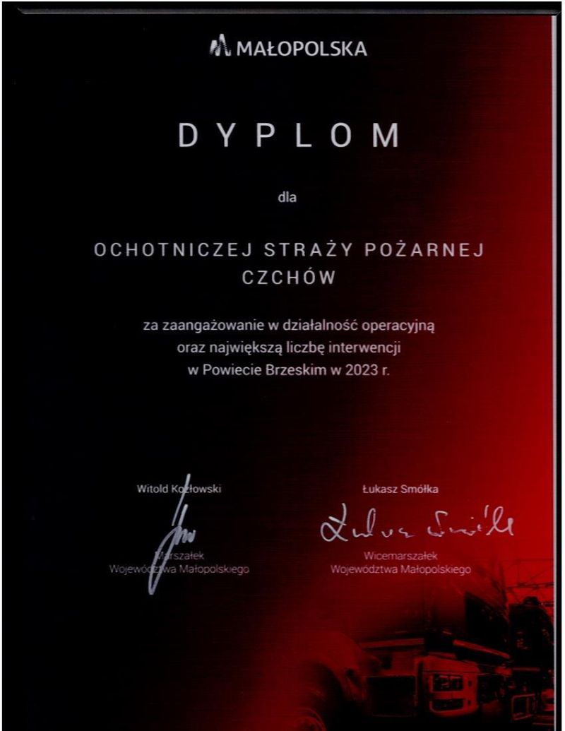 Z dumą informujemy, że jako jedyną z Powiatu Brzeskiego, uhonorowano w ten sposób Ochotniczą Straż Pożarną w Czchowie, której przedstawiciele w osobach Prezesa Jerzego Wojakiewicza oraz Naczelnika Stanisława Kozdroja, przy obecności Burmistrza Czchowa Marka Chudoby, wymienione wcześniej nagrody odebrali.