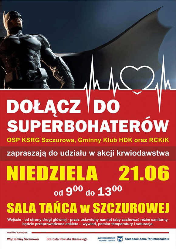 OSP Szczurowa, Gminny Klub HDK w Szczurowej oraz Regionalne Centrum Krwiodawstwa i Krwiolecznictwa w Krakowie zapraszają do udziału w akcji krwiodawstwa pn. „Dołącz do Superbohaterów” która odbędzie się w niedzielę 21 czerwca 2020 r. od godz. 9:00 do 13:00 w sali tańca w Szczurowej.