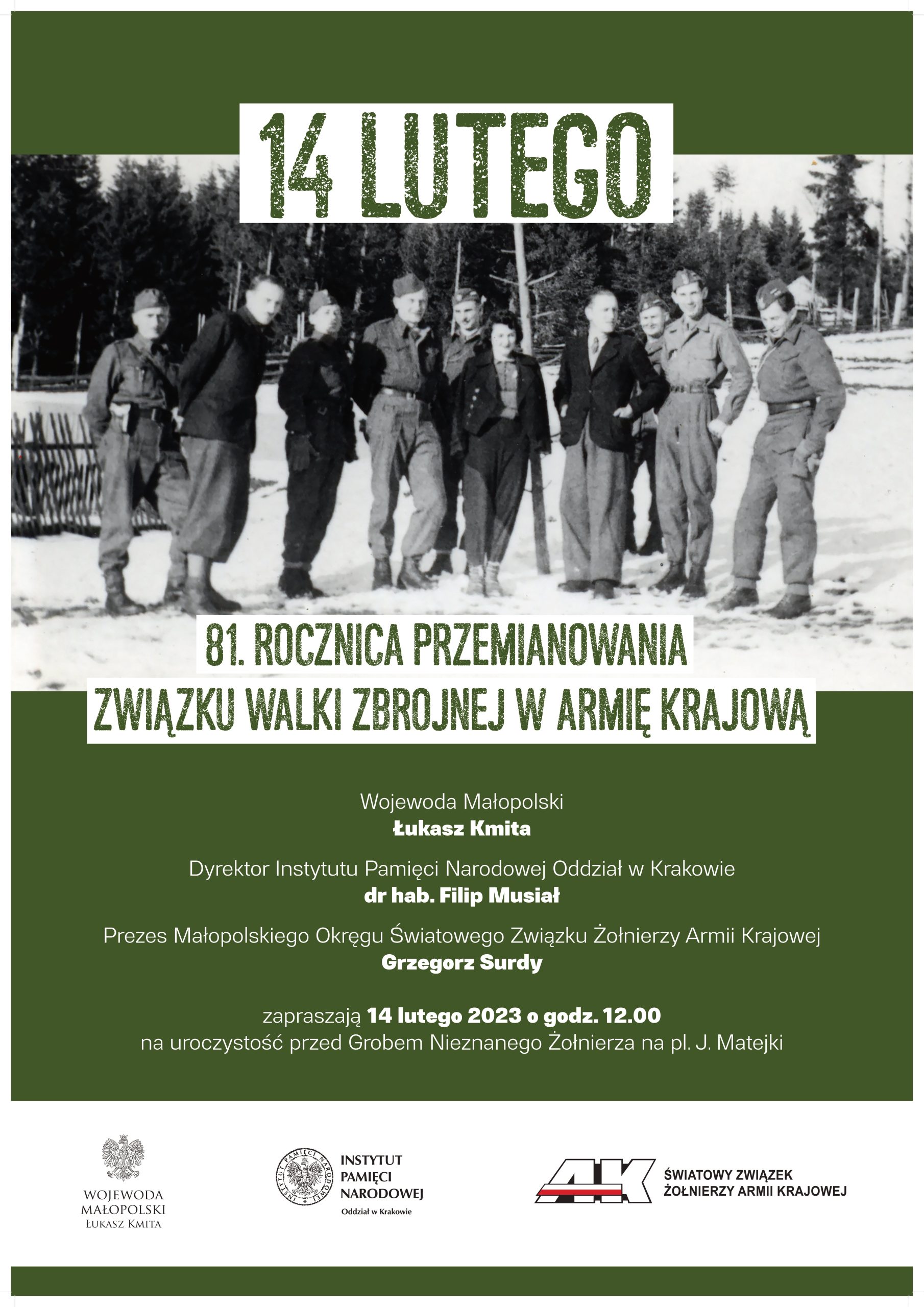 W tym roku przypada 81. rocznica utworzenia Armii Krajowej. Wojewoda małopolski Łukasz Kmita, dyrektor Instytutu Pamięci Narodowej Oddział w Krakowie dr hab. Filip Musiał oraz prezes Małopolskiego Okręgu Światowego Związku Żołnierzy Armii Krajowej Grzegorz Surdy zapraszają na krakowską uroczystość upamiętniającą przekształcenie Związku Walki Zbrojonej w AK – największą na świecie formację walki podziemnej.