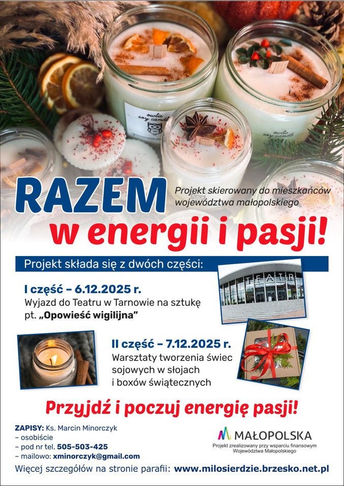 Parafia pw. Miłosierdzia Bożego w Brzesku realizuje projekt pt. „Razem w energii i pasji!” przy wsparciu finansowym Województwa Małopolskiego. Projekt jest dedykowany mieszkańcom województwa małopolskiego i stanowi odpowiedź na potrzebę budowania więzi międzypokoleniowych oraz aktywizowania lokalnej społeczności.