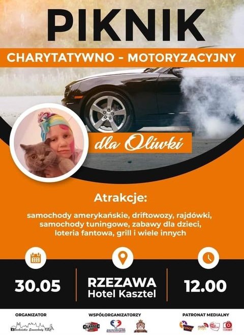 W niedzielę 30 maja 2021 r. o godzinie 12.00 obok hotelu Kasztel w Rzezawie wystartuje piknik charytatywno-motoryzacyjny, którego celem jest zbiórka pieniędzy na leczenie Oliwki Dzień. Organizatorzy przygotowali mnóstwo atrakcji. Zaprezentują się piękne i stylowe samochody, będą występy artystyczne oraz animacje dla dzieci. Wszystko to by wesprzeć małą Oliwkę! Zabierzcie swoje rodziny i znajomych – musicie tam być!