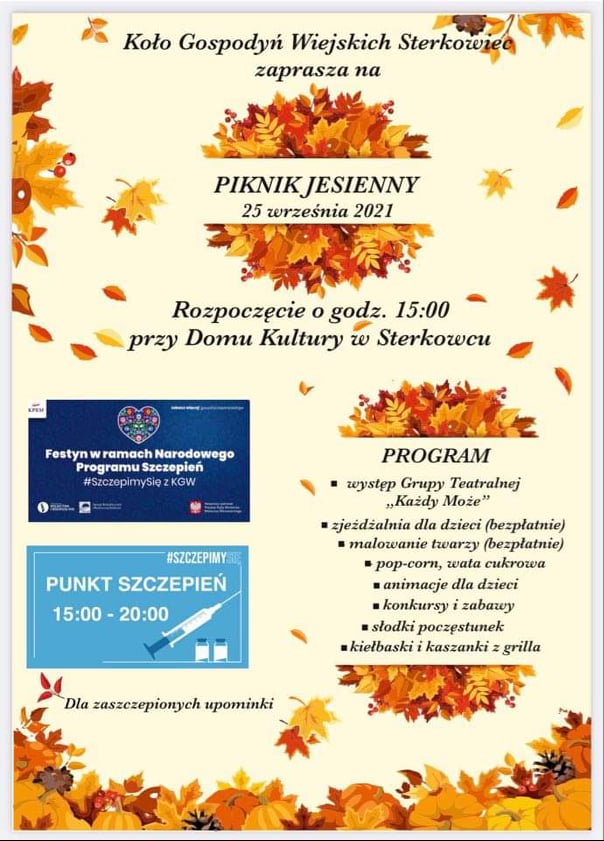 W sobotę 25 września 2021 r. Koło Gospodyń Wiejskich ze Sterkowca organizuje festyn na powitanie jesieni. Prognozy długoterminowe wskazują, że może być to jedna z ostatnich okazji na zabawę w plenerze. Organizatorzy szykują sporo atrakcji. Dodatkowo będzie można się zaszczepić przeciwko koronawirusowi.