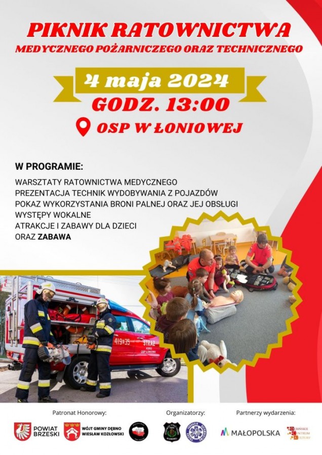 4 maja 2024 r. o godz. 13:00 przy Amfiteatrze Letnim w Łoniowej rozpocznie się Pierwszy Piknik Ratownictwa Medycznego, Pożarniczego oraz Technicznego.