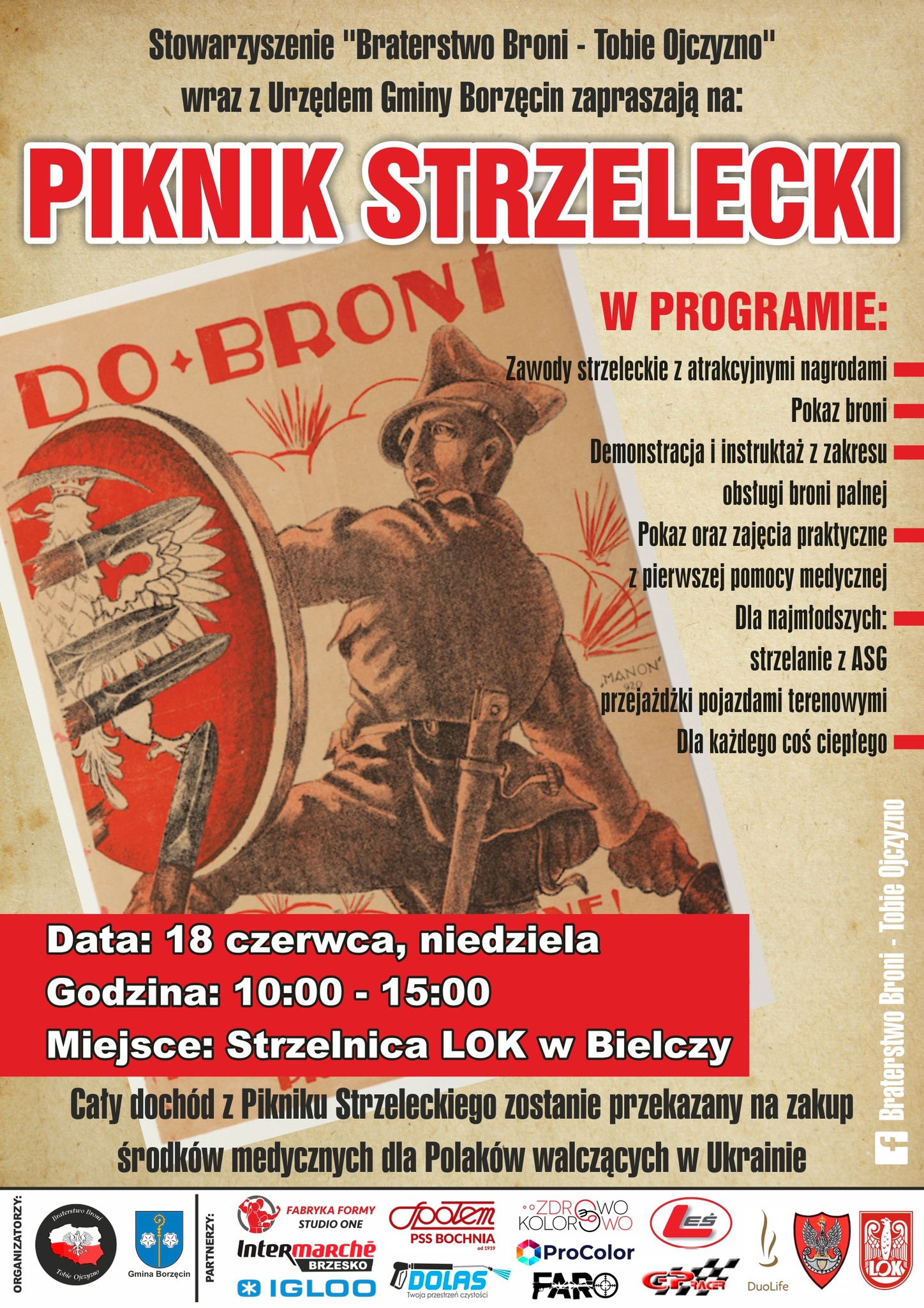 Stowarzyszenie Braterstwo Broni – Tobie Ojczyzno oraz Urząd Gminy w Borzęcinie Zapraszają na Piknik Strzelecki, który odbędzie się w najbliższą niedzielę, 18 czerwca 2023 r. na Strzelnicy LOK w Bielczy. Rozpoczęcie Pikniku o godz. 10:00.