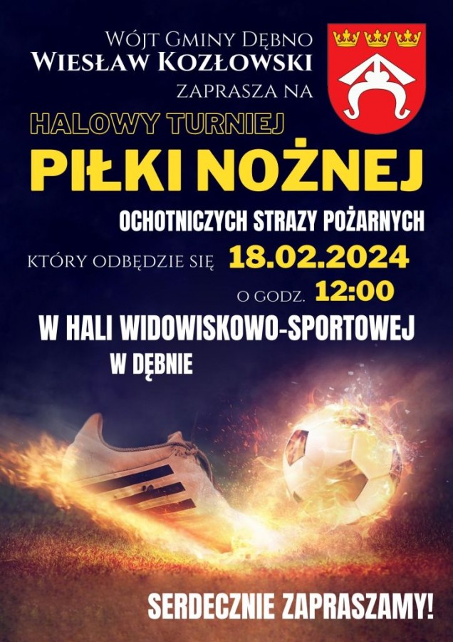 Gminny Turniej OSP w Piłce Halowej o Puchar Wójta Gminy Dębno, odbędzie się w niedzielę 18 lutego 2024 o godz. 12:00 w Hali Widowiskowo-Sportowej w Dębnie.