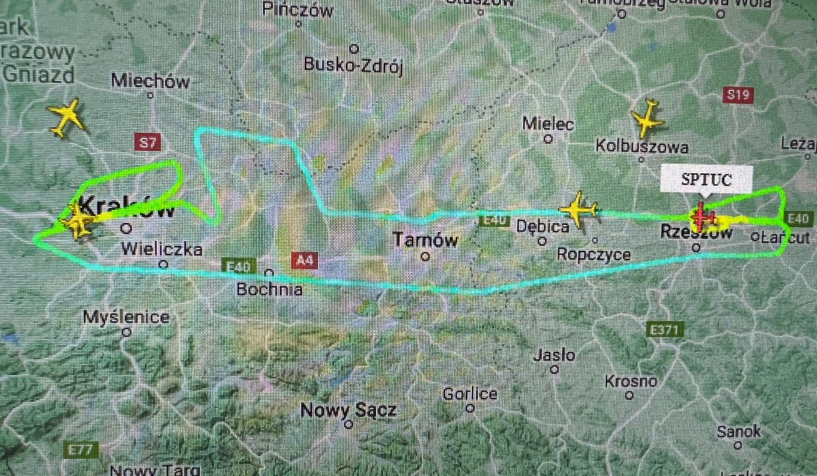 Przy tej okazji jednemu z naszych czytelników udało się uchwycić ciekawy przelot, jaki miał miejsce 22 lutego 2023 r. Samolot Piper PA-34-220T Seneca V należący do OKL-Ośrodka Kształcenia Lotniczego Politechniki Rzeszowskiej wykonywał lot szkolno-treningowy z lotniska w Rzeszowie na Balice i z powrotem. Trasa przelotu w obu kierunkach przebiegała nad Powiatem Brzeskim. Podczas przelotu na kilkusetkilometrowej trasie pilot zakreślił na niebie gigantyczną figurę w zarysie przypominającą samolot (lub wojskowego drona 🙂 ).