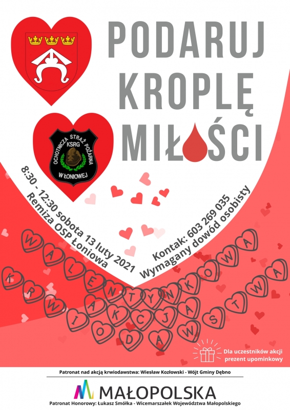 Ochotnicza Straż Pożarna w Łoniowej oraz Wójt Gminy Dębno Wiesław Kozłowski serdecznie zapraszają wszystkich ludzi dobrej woli na kolejną Walentynkową akcję krwiodawstwa „Podaruj Kroplę Miłości”, która odbędzie się 13 lutego br. (sobota) w godzinach od 8:30 do 12:30 w Remizie OSP w Łoniowej.