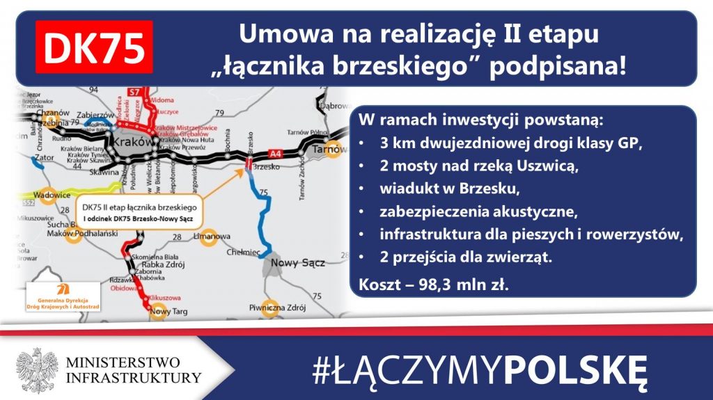 Generalna Dyrekcja Dróg Krajowych i Autostrad zawarła 23 listopada 2020 r. umowę na projekt i budowę pierwszego odcinka drogi krajowej nr 75 Brzesko – Nowy Sącz, czyli II etapu „łącznika brzeskiego”. Wykonawcą zadania o długości ok. 3 km będzie firma Eurovia Polska. Koszt prac wyniesie 98,3 mln zł.