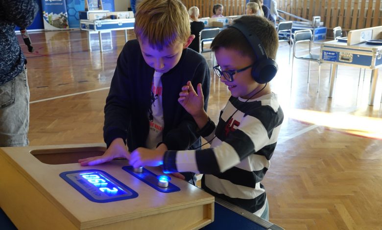 Na sali gimnastycznej uczniowie mieli możliwość zobaczyć i wypróbować przyrządy naukowe m.in. składany model ludzkiego ciała, najszybszą zjeżdżalnię, czy kulę plazmową. Odwiedzający wystawę, otrzymali dodatkowo „Poradnik młodego naukowca”, w którym znajdują się propozycje doświadczeń, do samodzielnego przeprowadzenia w domu czy klasie.