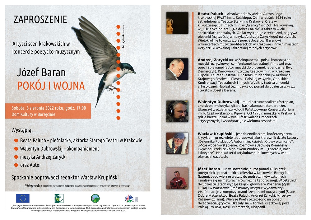 Poecie towarzyszyć będą artyści scen krakowskich (Beata Paluch, Walentyn Dubrowskij). W programie koncertu poetycko-muzycznego pt. „Pokój i wojna” znajdą się wiersze, prozy i piosenki poety rodem z Borzęcina, z muzyką kompozytora Andrzeja Zaryckiego. Spotkanie poprowadzi Wacław Krupiński – wieloletni redaktor „Dziennika Polskiego” i konferansjer.