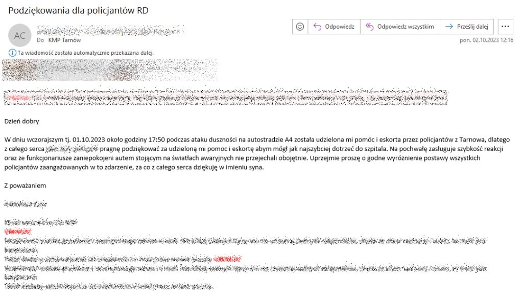 Wczoraj (1 października br.) po godz. 18.00 policjanci z tarnowskiej drogówki znaleźli się w odpowiednim miejscu i czasie, by udzielić pomocy. Patrolując tarnowski odcinek autostrady A4 w kierunku Rzeszowa asp. sztab. Grzegorz Kowalczyk i st. post. Michał Foltyn zauważyli zatrzymany na pasie awaryjnym, na wysokości 496 kilometra samochód osobowy. Funkcjonariusze od razu zareagowali. Zatrzymali radiowóz, aby sprawdzić, co się stało. Szybko ustalili, że w czasie jazdy 4-letni chłopiec nagle stracił przytomność. Ojciec niezwłocznie powiadomił służby i natychmiast zaczął ratować dziecko. W tym momencie inicjatywę przejęli policjanci. Powiadomili dyżurnego o zaistniałej sytuacji zagrożenia życia dziecka, a następnie podjęli błyskawiczną decyzję o pilotażu do tarnowskiego szpitala. Jadąc aleją Jana Pawła w Tarnowie w kierunku szpitala dołączył do pilotażu drugi radiowóz. Po dotarciu na miejsce chłopiec trafił na szpitalny oddział ratunkowy. Podjęcie trudnej, a jednocześnie właściwej decyzji o transporcie spowodowało, że życie chłopca zostało uratowane.
