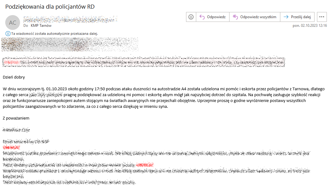 Wczoraj (1 października br.) po godz. 18.00 policjanci z tarnowskiej drogówki znaleźli się w odpowiednim miejscu i czasie, by udzielić pomocy. Patrolując tarnowski odcinek autostrady A4 w kierunku Rzeszowa asp. sztab. Grzegorz Kowalczyk i st. post. Michał Foltyn zauważyli zatrzymany na pasie awaryjnym, na wysokości 496 kilometra samochód osobowy. Funkcjonariusze od razu zareagowali. Zatrzymali radiowóz, aby sprawdzić, co się stało. Szybko ustalili, że w czasie jazdy 4-letni chłopiec nagle stracił przytomność. Ojciec niezwłocznie powiadomił służby i natychmiast zaczął ratować dziecko. W tym momencie inicjatywę przejęli policjanci. Powiadomili dyżurnego o zaistniałej sytuacji zagrożenia życia dziecka, a następnie podjęli błyskawiczną decyzję o pilotażu do tarnowskiego szpitala. Jadąc aleją Jana Pawła w Tarnowie w kierunku szpitala dołączył do pilotażu drugi radiowóz. Po dotarciu na miejsce chłopiec trafił na szpitalny oddział ratunkowy. Podjęcie trudnej, a jednocześnie właściwej decyzji o transporcie spowodowało, że życie chłopca zostało uratowane.