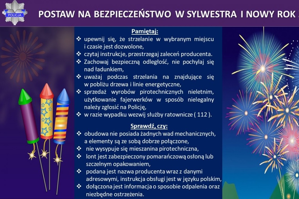 Zbliża się okres noworoczny, więc w sklepach można kupić fajerwerki. Pamiętajmy, że korzystając z petard i tego typu asortymentu musimy zachować szczególną ostrożność i rozsądek. Są one materiałami wybuchowymi, które mogą być niebezpieczne dla życia i zdrowia. Używajmy fajerwerków tylko w takim miejscu, w którym nie spowodują one zagrożenia dla innych oraz nie wywołają pożaru.