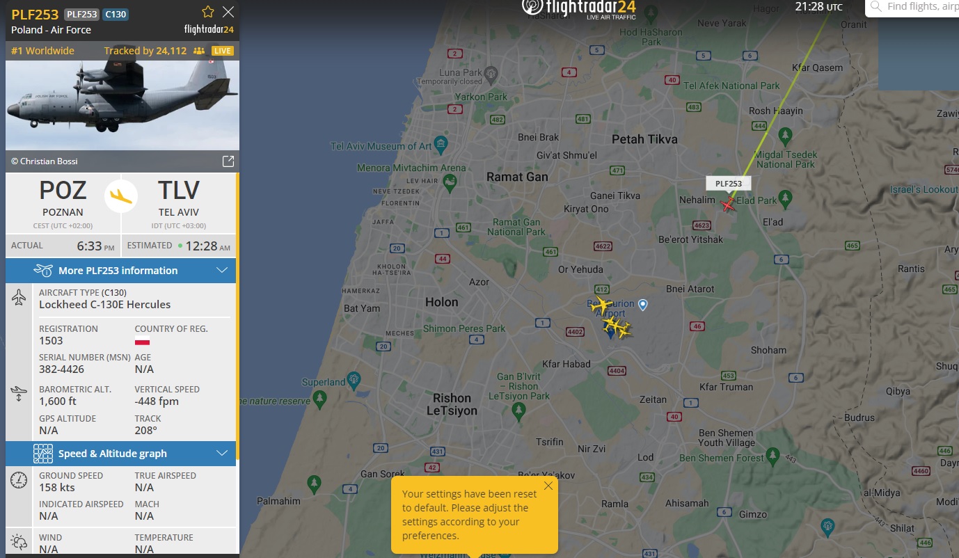 Za pomocą popularnego serwisu FlightRadar24 dziesiątki tysięcy osób z całego świata śledziło przelot polskich C-130 Hercules, które dziś wyleciały do Izraela. Mają wylądować na lotnisku Ben Guriona w Tel Awiwie.