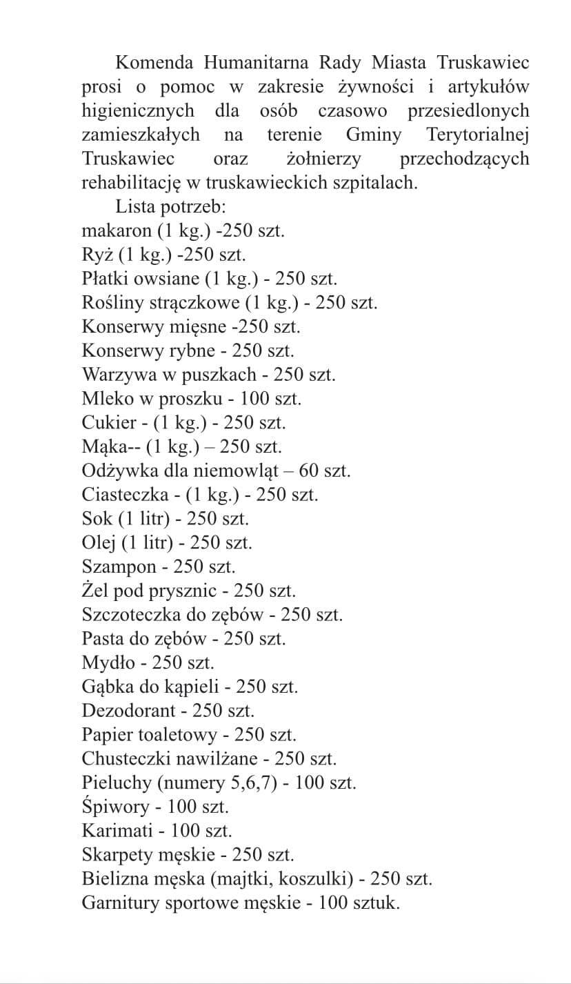 Komenda Humanitarna Rady Miasta Truskawiec prosi za pośrednictwem Eleny o pomoc w zakresie żywności i artykułów higienicznych dla osób czasowo przesiedlonych zamieszkałych na terenie Gminy Terytorialnej Truskawiec oraz żołnierzy przechodzących rehabilitację w truskawieckich szpitalach. Potrzebne są podstawowe artykuły żywnościowe, a także środki higieniczne oraz karimaty, śpiwory i dresy. Pełna liste zamieszczamy poniżej. Elena deklaruje, że zawiezie przekazane dary do Truskawca.