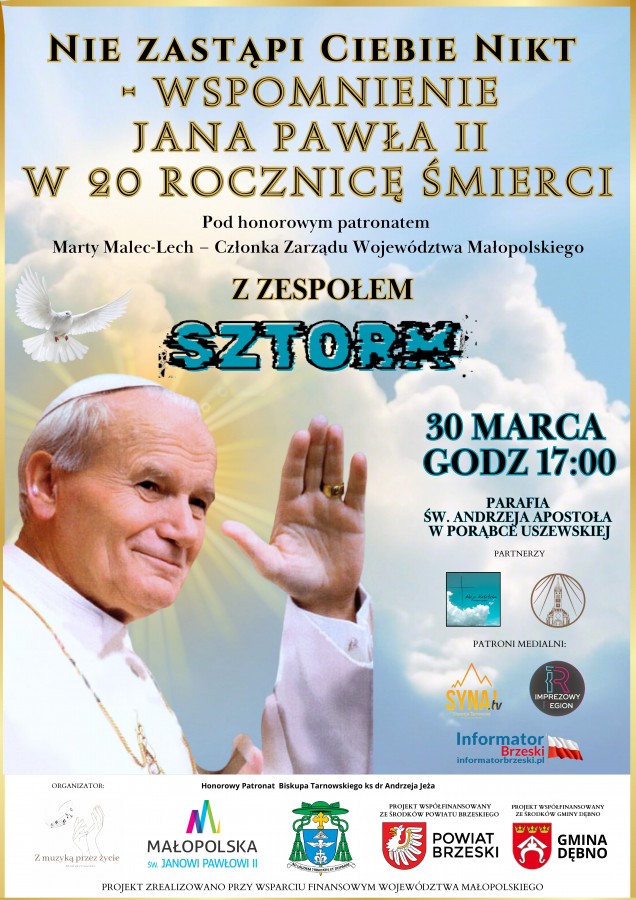 Z okazji 20. rocznicy śmierci św. Jana Pawła II zapraszamy na wyjątkowy koncert pod tytułem „Nie zastąpi Ciebie nikt – wspomnienie Jana Pawła II w 20. rocznicę śmierci”. To niezwykłe wydarzenie, współorganizowane z Parafią Porąbka Uszewska oraz oddziałem Akcji Katolickiej tamtejszej parafii jest wyrazem wdzięczności i pamięci o Wielkim Papieżu Polaku.