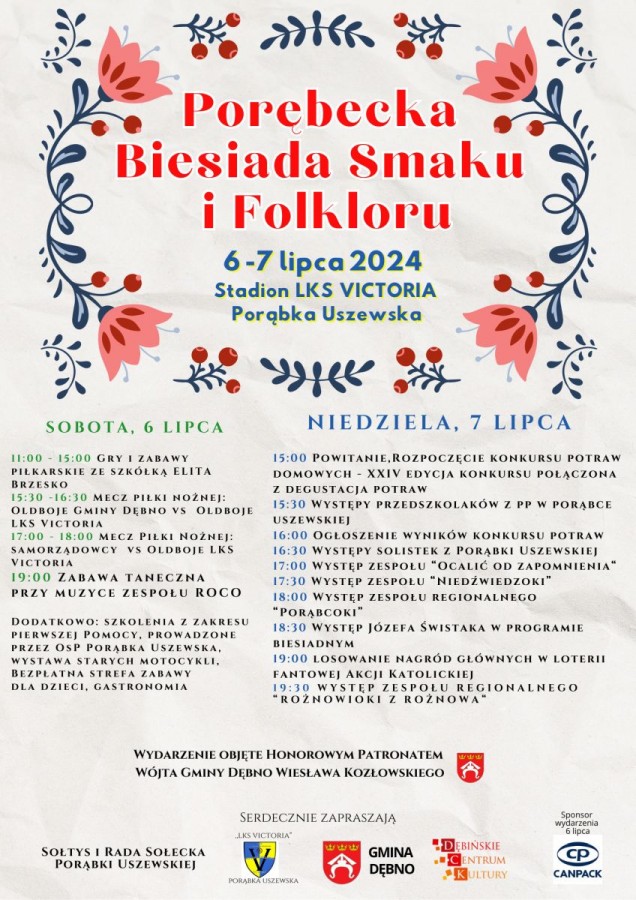 Serdecznie zapraszamy na wyjątkowe kulinarne wydarzenie – Porębecką Biesiadę Smaku i Folkloru, która odbędzie się w dniach 6-7 lipca na stadionie LKS Victoria Porąbka Uszewska.
