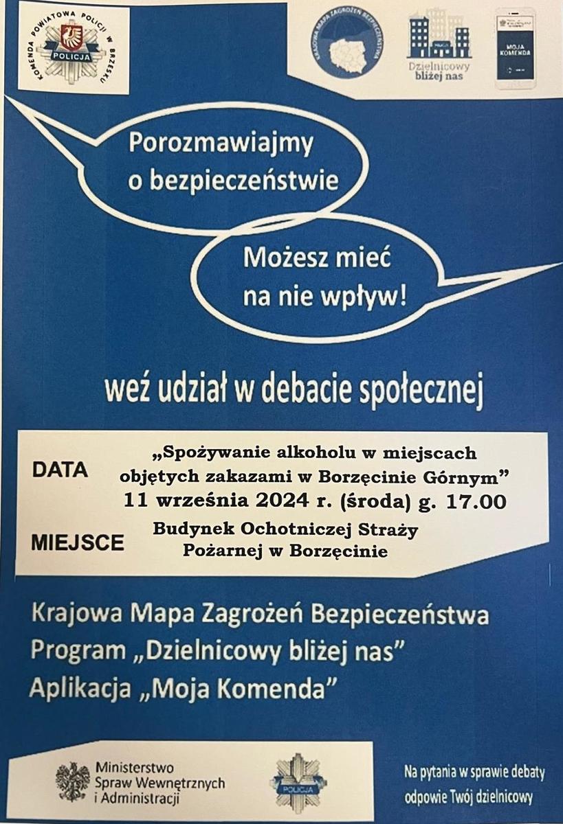 Policjanci zapraszają na spotkanie, które odbędzie się w środę, 11 września, o godzinie 17.00, w budynku Ochotniczej Straży Pożarnej w Borzęcinie. Tematem debaty będzie problematyka związana ze spożywaniem alkoholu w miejscach objętych zakazami w Borzęcinie Górnym.