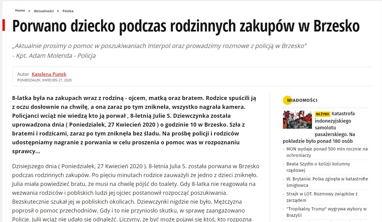 Autor posta informuje na stronie fikcyjnego serwisu http://localnewshere.site/ o porwaniu dziecka podczas rodzinnych zakupów w Brzesku. Do prośby o pomoc w poszukiwaniach załączona jest wypowiedź nieistniejącego kapitana Adama Molendy, informującego o rozmowach prowadzonych z Interpolem i policją w Brzesku. Całość została „uwiarygodniona” fikcyjnymi komentarzami zatroskanych osób, oraz odnośnikiem do rzekomego nagranie z kamer monitoringu.