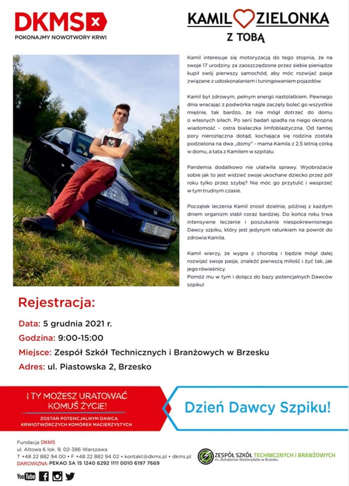 – A teraz Kochani, mobilizujemy się, zbieramy energię i widzimy się 5 grudnia na terenie szkoły Zielonki w Brzesku i zapisujemy się do bazy dawców DKMS aby znaleźć dla Kamila genetycznego bliźniaka! – zachęca ciocia Kamila.