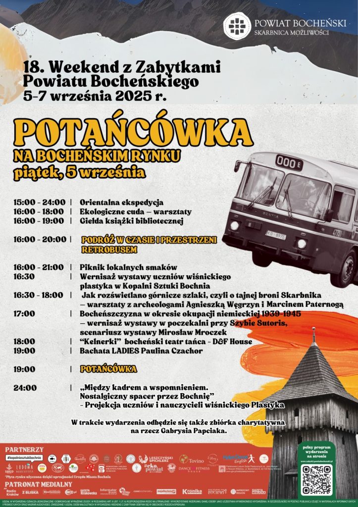 Już w najbliższy piątek, 5 września, Rynek w Bochni wypełni się atrakcjami przygotowanymi w ramach 18. Weekendu z Zabytkami Powiatu Bocheńskiego. Pierwszy dzień wydarzenia upłynie pod znakiem spotkań z historią, kulturą i muzyką, a jego kulminacją będzie potańcówka pod gołym niebem.