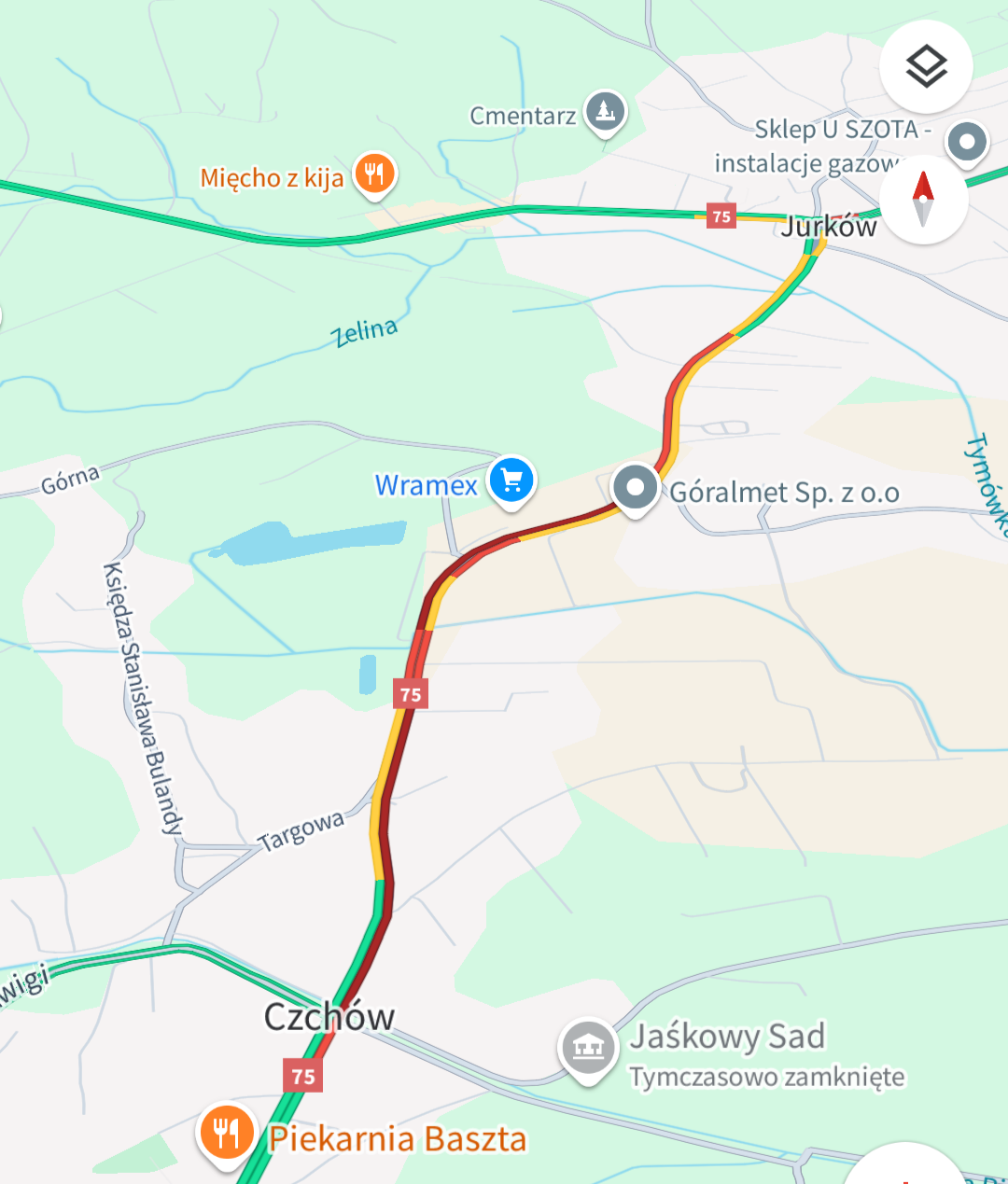 Mapa natężenia ruchu na drodze krajowej nr 75 w Czchowie – 12 grudnia 2024 r. Godz. 17.30