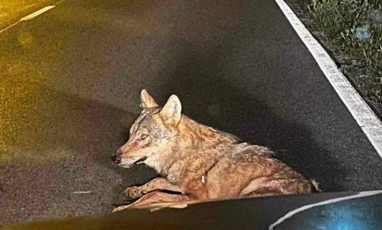 Potrącony wilk na drodze w miejscowości Sukmanie