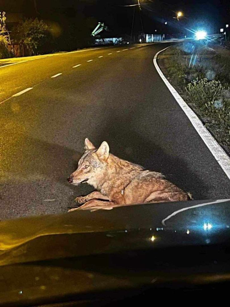 Potrącony wilk na drodze w miejscowości Sukmanie