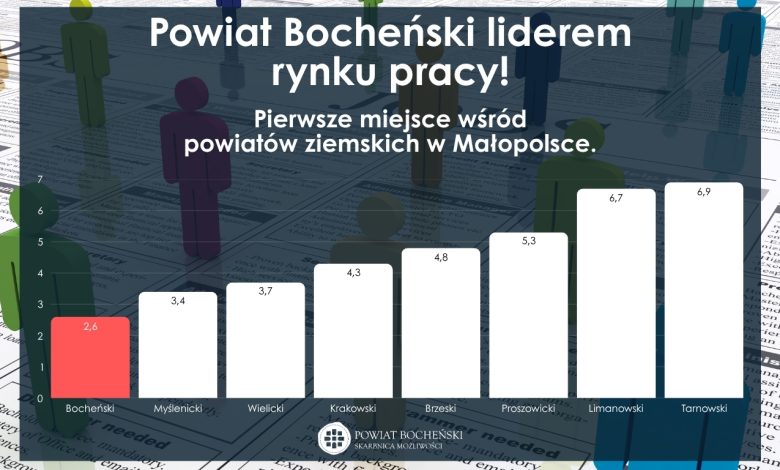 Powiat Bocheński może pochwalić się znakomitymi wynikami – według najnowszych danych z końca kwietnia 2025 r., zajmujemy pierwsze miejsce wśród powiatów ziemskich w Małopolsce pod względem najniższej stopy bezrobocia. Lepszym wynikiem może pochwalić się jedynie Kraków, spośród miast na prawach powiatu.