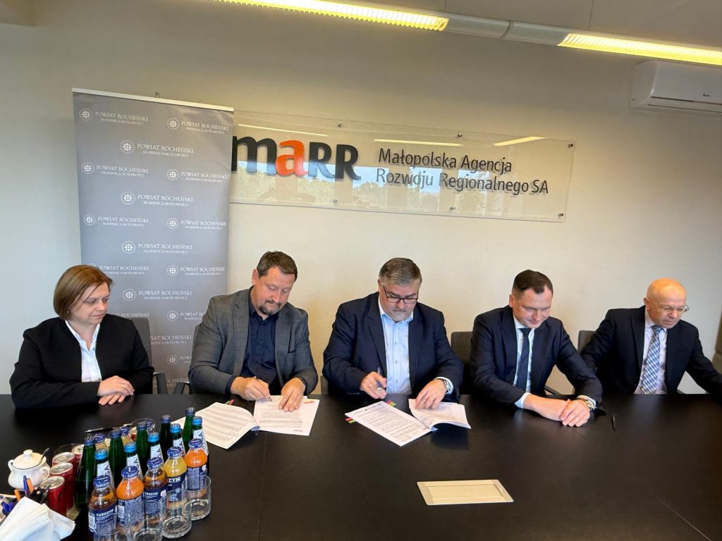 Podpisanie umowy odbyło się w siedzibie Małopolskiej Agencji Rozwoju Regionalnego w Krakowie. Dokument podpisali przedstawiciele MARR S.A. Marcin Kozik Prezes Zarządu i Witold Olech Wiceprezes oraz przedstawiciele Powiatu Bocheńskiego: Starosta Adam Korta, Wicestarosta Ryszard Drożdżak i Skarbnik Powiatu Ewa Wełna.