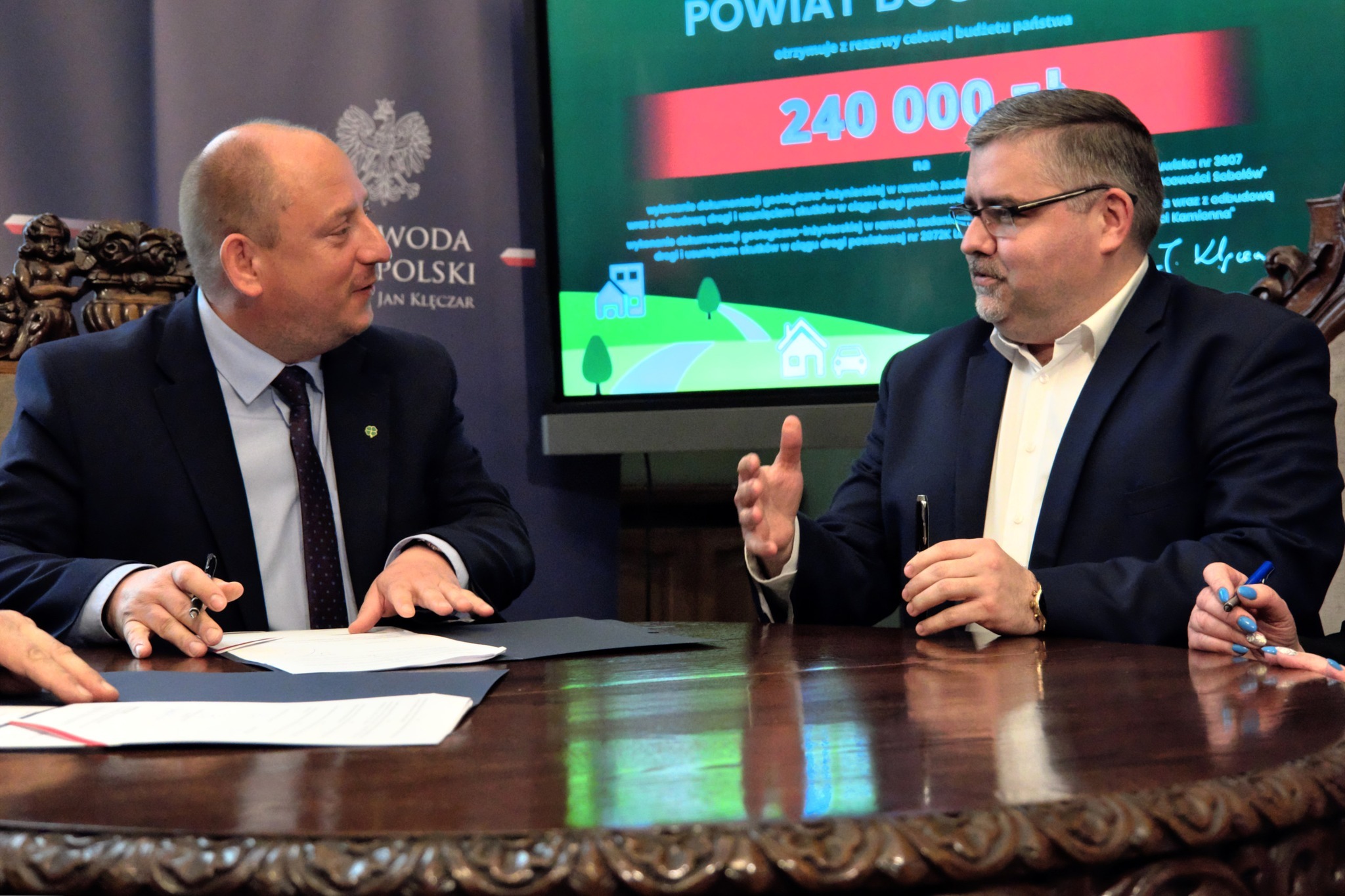 Umowę na dofinansowanie z Wojewodą Małopolskim Janem Krzysztofem Klęczarem podpisali Starosta Bocheński Adam Korta i Wicestarosta Ryszard Drożdżak. Powiat Bocheński otrzyma 240 tysięcy złotych ze środków pochodzących z rezerwy celowej budżetu państwa na usuwanie skutków ruchów osuwiskowych ziemi. Przyznane dofinansowanie dotyczy opracowania dokumentacji geologiczno-inżynierskiej na osuwiska przy drogach powiatowych w Sobolowie i Kamionnej.