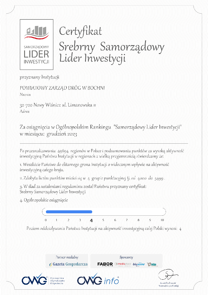 Powiatowy Zarząd Dróg otrzymał certyfikat – Srebrny Samorządowy Lider Inwestycji za osiągnięcia w Ogólnopolskim Rankingu.