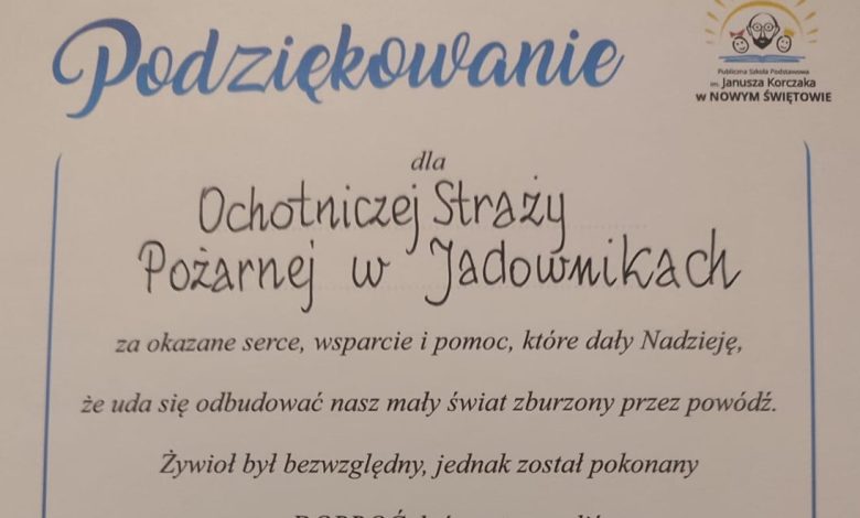 W poniedziałek 2 listopada 2024 r. druhowie z OSP Jadowniki zamieścili na swoim profilu podziękowania jakie napłynęły z jednej z najbardziej dotkniętych przez wrześniową powódź miejscowości – Nowego Świętowa.