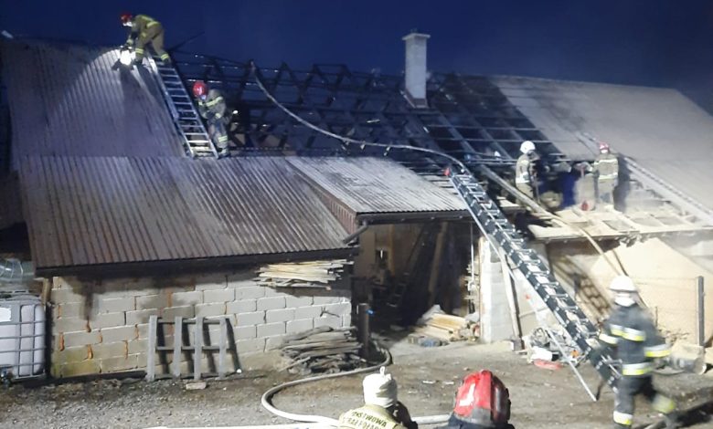 W momencie przybycia strażaków ogień obejmował wnętrze budynku, a pożar zniszczył część więźby oraz pokrycia dachowego. We wnętrzu budynku składowane były m.in. trociny i inne materiały łatwopalne.