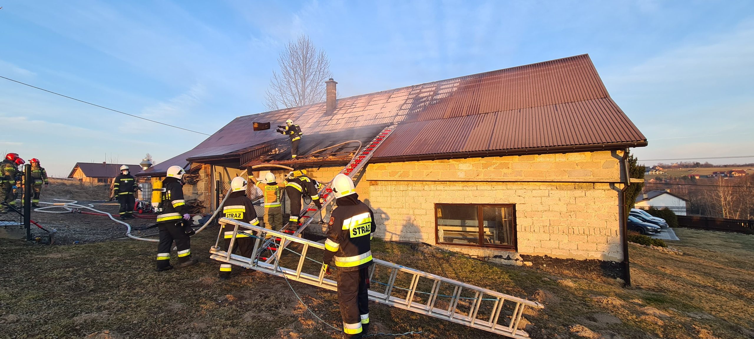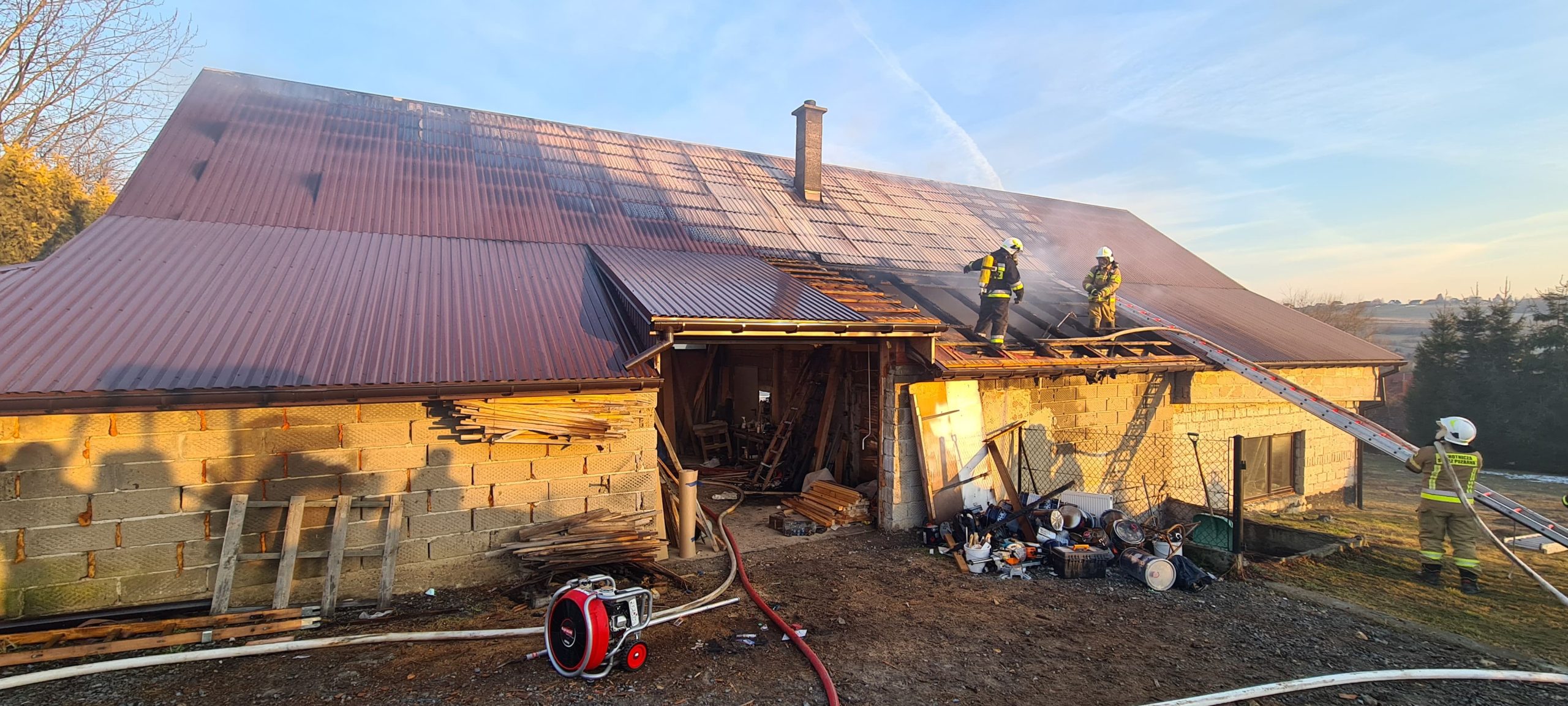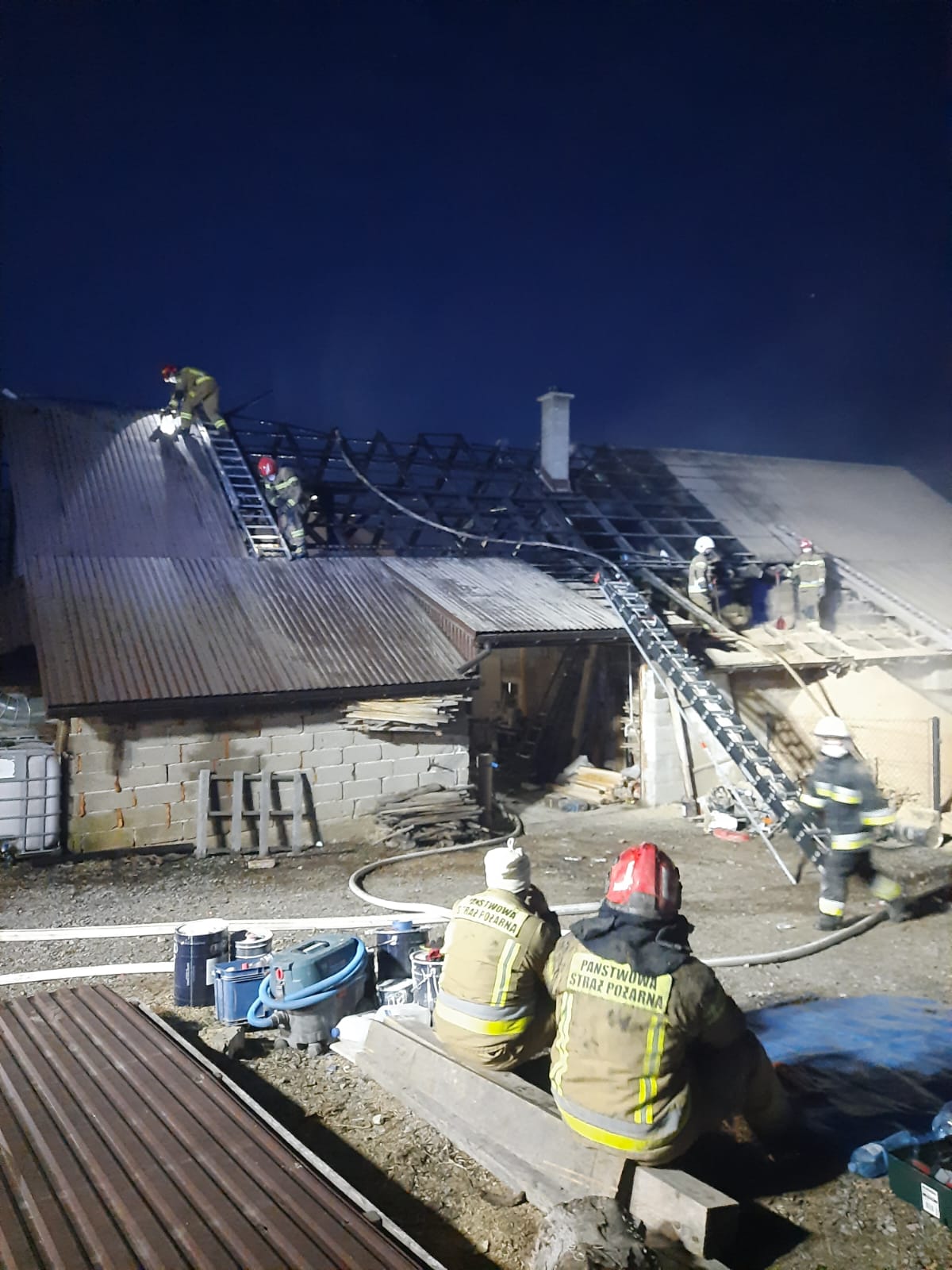 W momencie przybycia strażaków ogień obejmował wnętrze budynku, a pożar zniszczył część więźby oraz pokrycia dachowego. We wnętrzu budynku składowane były m.in. trociny i inne materiały łatwopalne.
