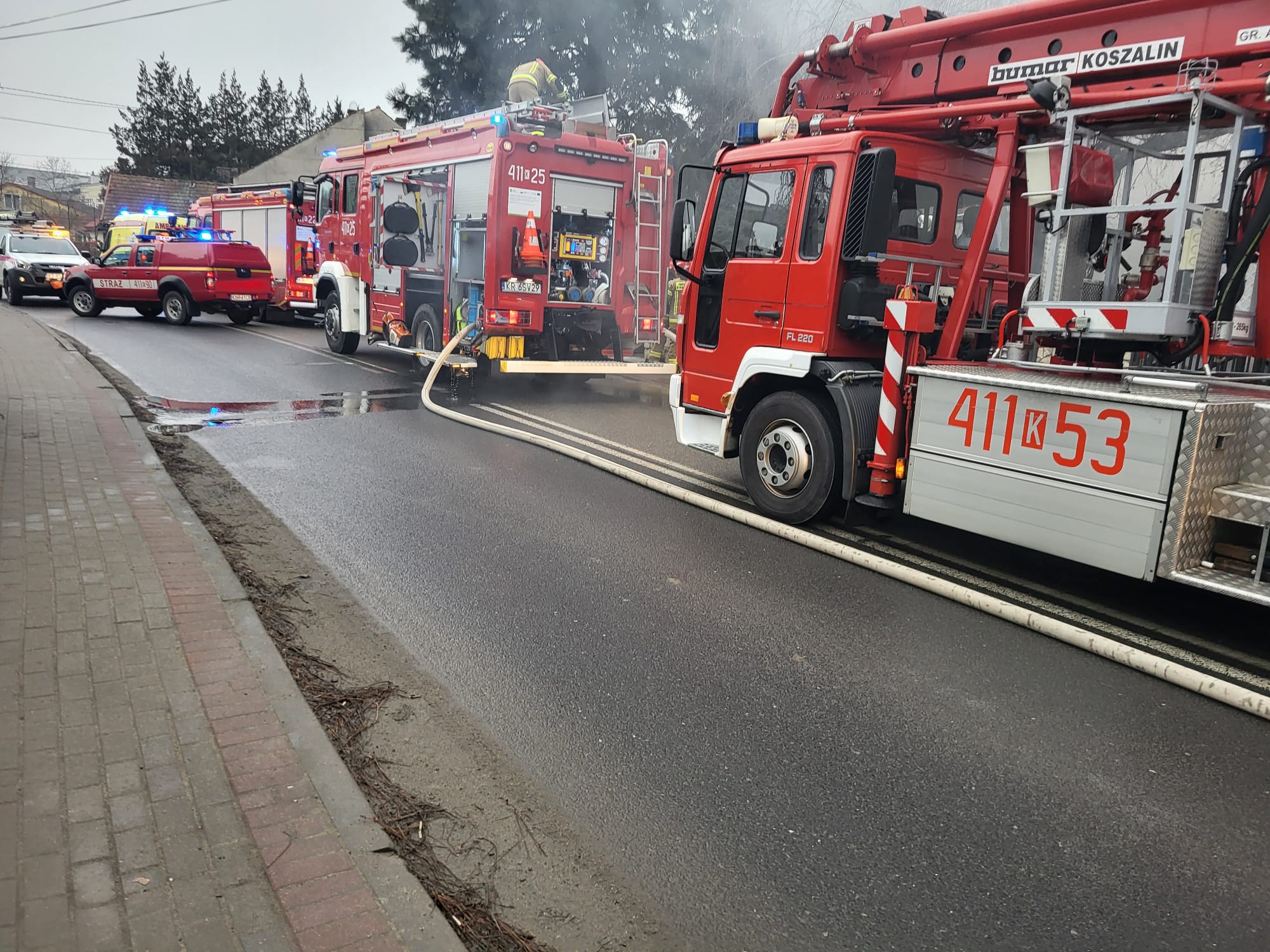 Na czas prowadzenia akcji ratowniczej występują znaczne utrudnienia w ruchu. Pojazdy gaśnicze blokują przejazd.