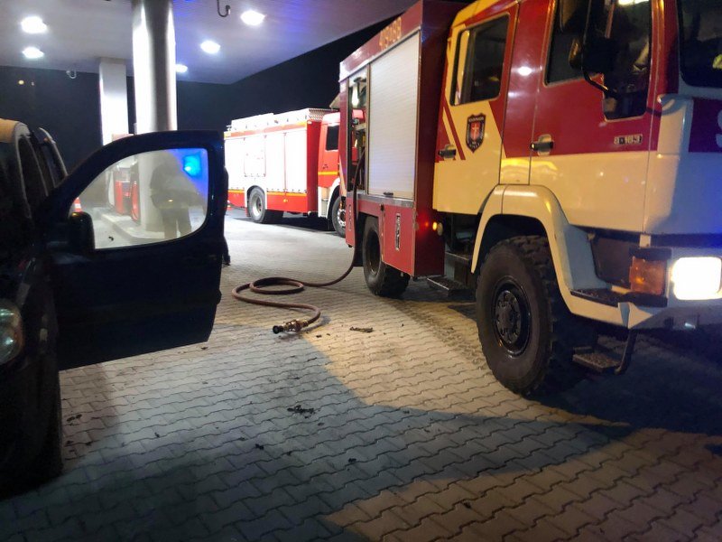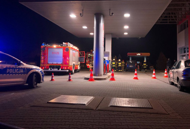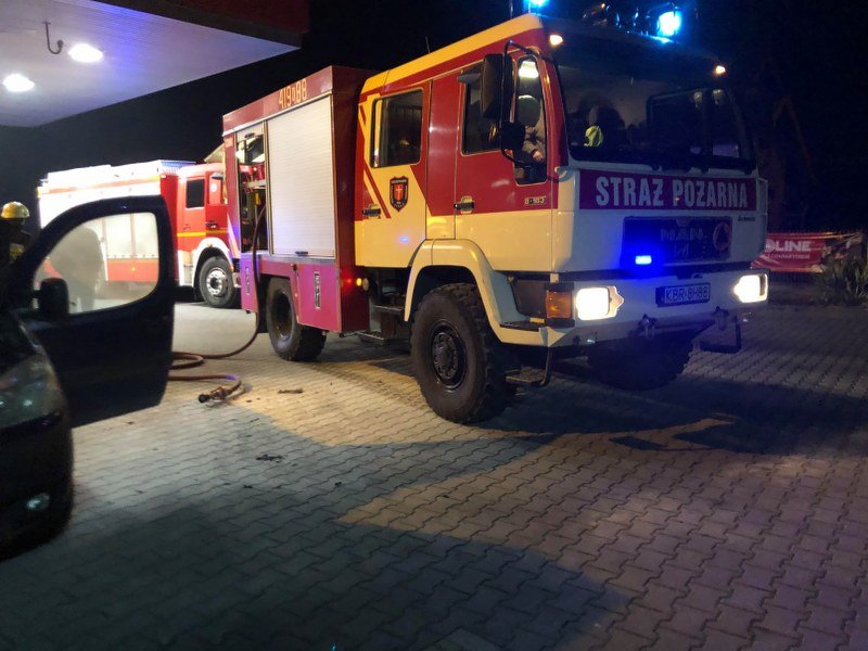Wg informacji jakie otrzymali strażacy – w samochodzie miała znajdować się osoba nieprzytomna. Po przybyciu na miejsce stwierdzono, że pożar został ugaszony przez pracownika stacji a poszkodowany został wyciągnięty z pojazdu. Działania straży polegały na zabezpieczeniu miejsca zdarzenia oraz udzieleniu kwalifikowanej pierwszej pomocy osobie poparzonej.
