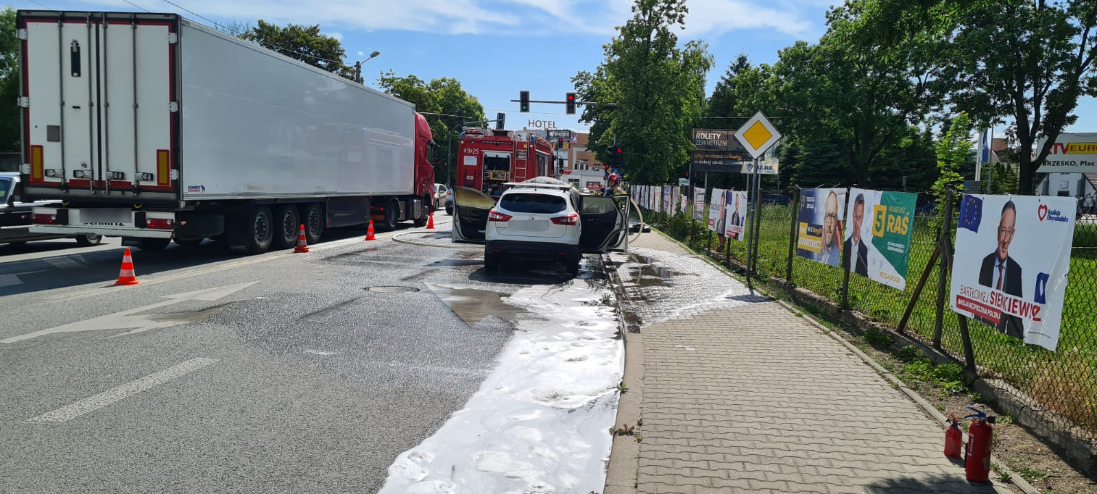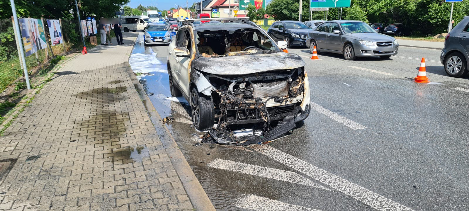 We wtorek 28 maja 2024 r. około godziny 15 na ul. Mickiewicza w Brzesku (w pobliżu skrzyżowania z ulicą Browarną) doszło do pożaru suv-a. Ogień zajął komorę silnika oraz uszkodził wnętrze pojazdu.