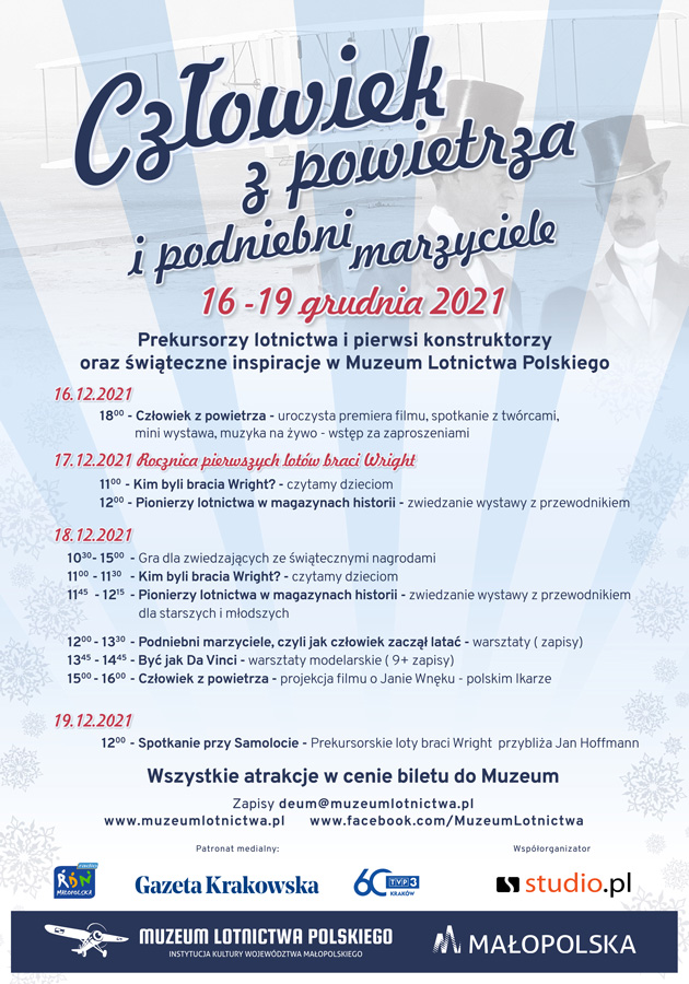 Oprócz projekcji filmowej w Kinie Lotnik i mini wystawy na wszystkich chętnych czekać będą warsztaty i spotkania związane zarówno z pierwszymi wynalazkami lotniczymi zapoczątkowanymi przez Leonarda da Vinci, jak i z prekursorskimi lotami braci Wright uważanymi oficjalnie za konstruktorów pierwszego samolotu. 17 grudnia obchodzimy 118. Rocznicę ich pierwszych lotów. Nie zabraknie też lotniczych akcentów świątecznych, gry z nagrodami i oprowadzania tematycznego po ekspozycjach.