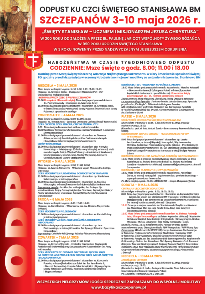 W niedzielę 3 maja 2026 r. w Szczepanowie rozpocznie się tygodniowy odpust ku czci św. Stanisława Biskupa i Męczennika – głównego patrona Polski. Tegorocznym uroczystościom towarzyszyć będzie hasło: „Święty Stanisław – uczniem i misjonarzem Jezusa Chrystusa”. Odpust wpisuje się w 200. rocznicę założenia przez bł. Paulinę Jaricot Wspólnoty Żywego Różańca, 990. rocznicę urodzin św. Stanisława oraz trzeci rok nowenny przed Nadzwyczajnym Jubileuszem Odkupienia.