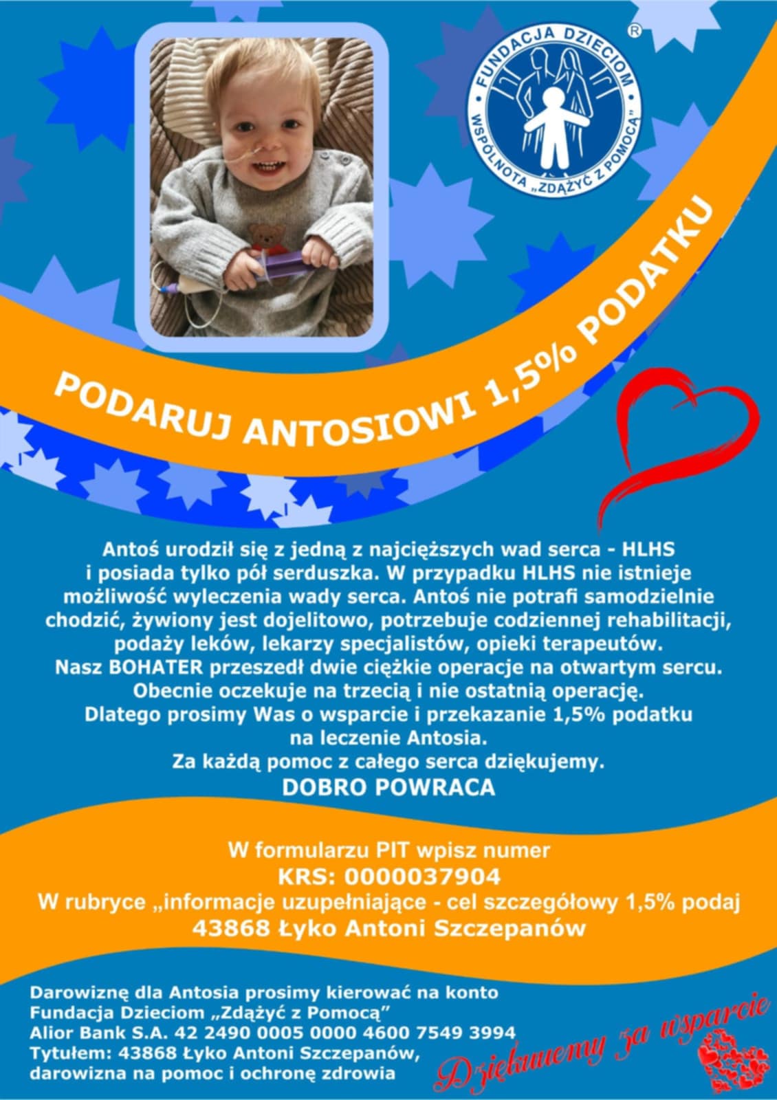 Obecnie oczekuje na trzecią i nie ostatnią operację. Dlatego prosimy Was o wsparcie i przekazanie 1,5% podatku na leczenie Antosia.