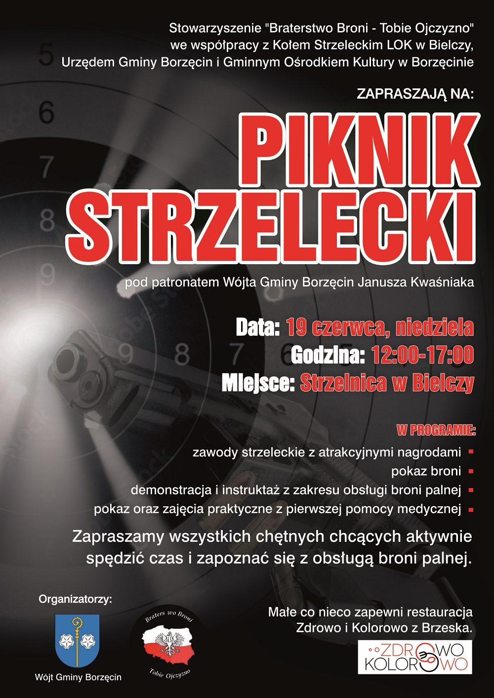 Zapraszamy już w najbliższą niedzielę 19 czerwca do Bielczy na „Piknik strzelecki”. W godzinach od 12.00 do 17.00 na miejscowej strzelnicy zaplanowano zawody strzeleckie z nagrodami, demonstrację i instruktaż z zakresu obsługi broni palnej, a także pokaz i zajęcia praktyczne z pierwszej pomocy medycznej.